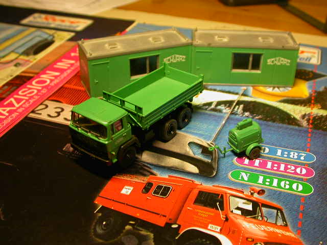 Magirus-Deutz 310 D 6x4, zwei Baucontainer und Kompressoranhänger. Die Baucontainer (Bausatz) stammen aus dem Kibri-Programm und der Kompressor (Bausatz) aus dem Preiser-Programm.
