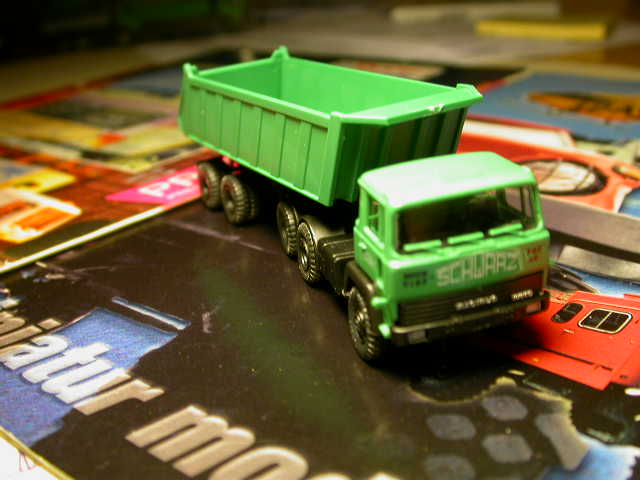 Magirus-Iveco 310D 6x7 mit Meiller Stahlmulden-Hinterkipper. Der Hinterkipper stammt aus dem Kibri-Programm.