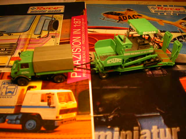 Unimog U1300 mit Pritsche, Scheuerle-Dreiachs-Tieflader und Demag-Deckenfertiger (Bausatz!) Der Bausatz ist speziell von Kibri für Roco hergestellt worden!