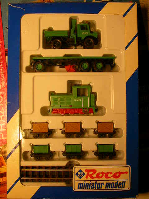 Schöma-Feldbahndiesellok, drei Kasten und drei Holzloren, Schienen, sowie Unimog U1300 L mit Dreiachs-Plattformrungenhänger